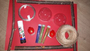 Wat zou ik van deze spulletjes kunnen maken voor Kerst? Door de combinatie touw en takken zag ik al direct een mobile voor mij. En het staaldraad deed mij denken aan de oorbellen die ik vroeger maakte. Wacht eens, de meisjes hebben van die glimmende spulletjes liggen.